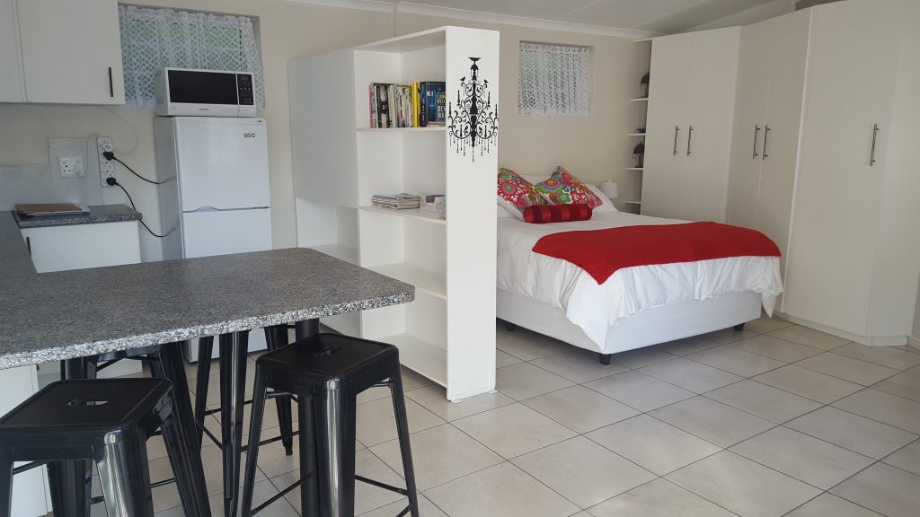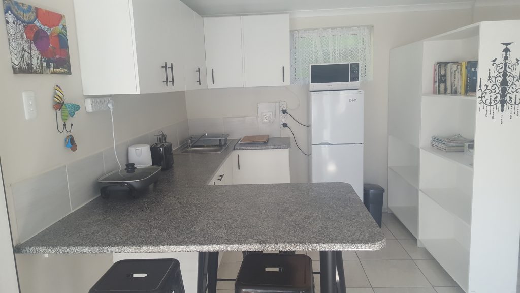 You book the entire unit for 1 – 2 guests. The cottage provides 1 bedroom with kitchenette, 1 bathroom with shower, secure parking and own entrance.